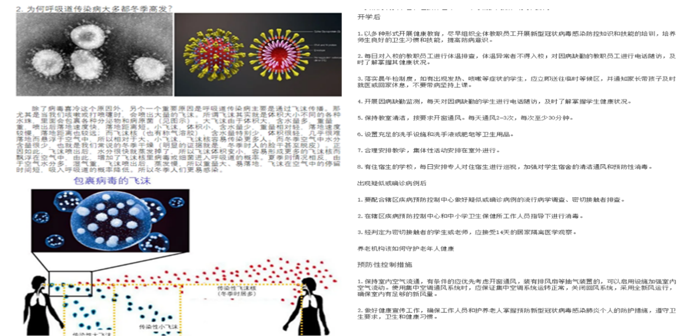 按照任务安排,前三天由崔志聪、李岩、刘松源和马宇鑫四人撰写文章,崔佳维整理并在公众号发布。科普文章内容主要包括:新冠病毒及相关基本知识介绍、传播方式及防疫方法、疫情期间的情绪问题、公共场合防疫须知等,涉及中小学、养老机构、餐厅、公园四大地点。此外,公众号还介绍了新冠病毒的基本情况、侵入细胞到被杀死的过程、潜伏期、疑似病例和确诊病例、传播方式等内容,并且介绍了一些具体的防疫小方法。另外,公众号还解释了呼吸道传染病在冬季高发是由于飞沫传播、蚊子无法传播新冠病毒,通过更深入地了解新冠病毒,大家必定能做出正确的应对措施,共同筑牢防疫的“铜墙铁壁”。在“情绪”一篇中,文章首先指出了在疫情期间有适当的担忧情绪是正常现象,然后通过介绍大脑中的激素反应解释了为什么在疫情期间情绪可能会在平静、恐惧与焦虑之间转化,最后,给出了一些应对几种情绪问题的具体方法和一般方法,旨在学习如何保持积极的情绪、平和的状态。同时,“防疫须知”一篇介绍了一些预防性措施和监测检查措施,出现病例的应对方法,以及对餐厅职工、用餐人员、游客的防疫要求。