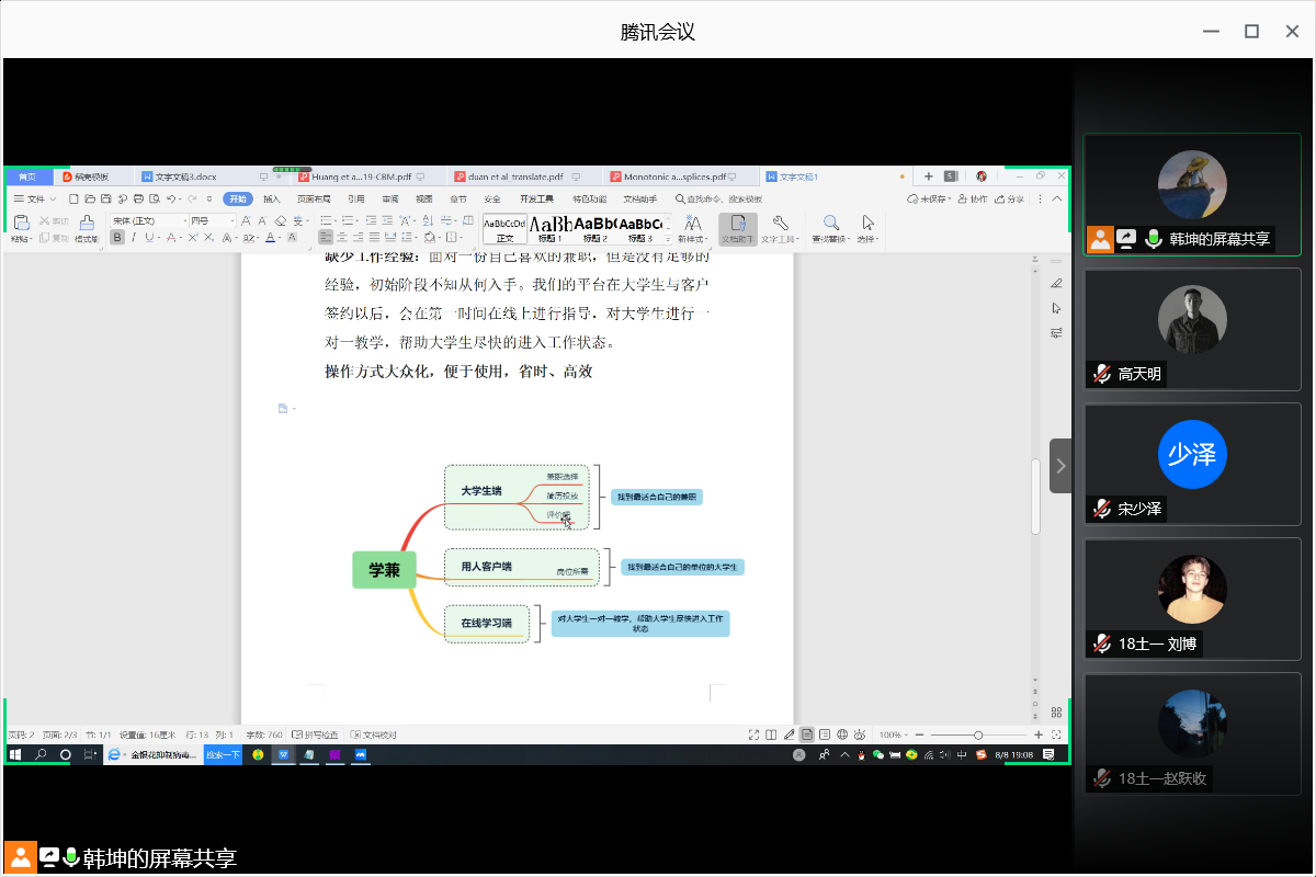 8月8日晚,Beat365官方网站关于对家乡所在地企业复工复产和大学生就业形势及行业政策调研下“学兼”APP软件设计创新队召开前期调研线上讨论会议,就前期实地调研结果进行分析讨论。本次会议由队长韩坤主持,全体团队成员参与。