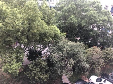 前院场地较大,有一中心花园,树木灌木植被茂盛,长椅和运动器材散布,白天常有小孩玩耍,晚上老人在这儿喝茶聚会,跳广场舞。