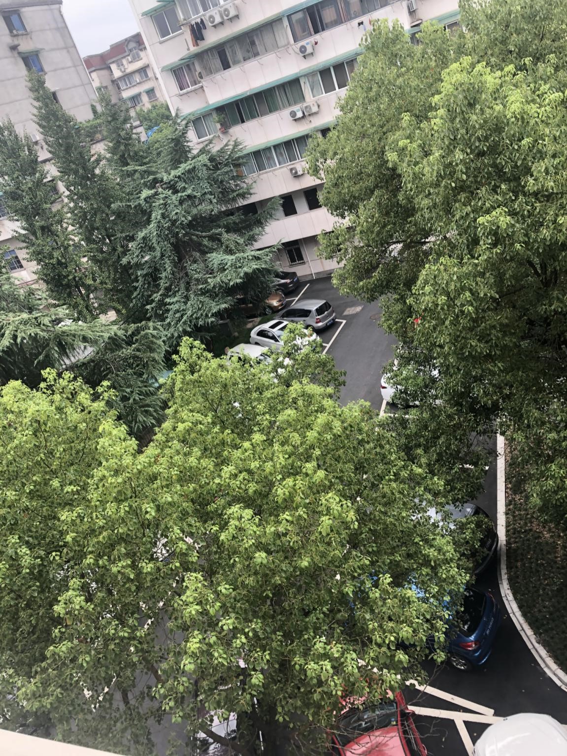 后院从前为无人打理的绿化区域,现因小区车位紧缺,改为停车区域,没有绿化,无人聚集。