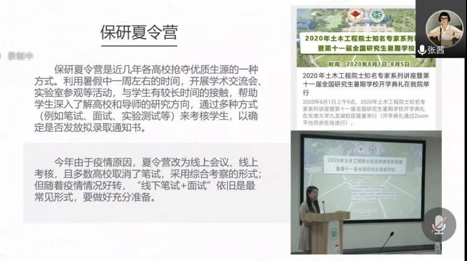 本次保研经验分享会由保研流程综述、详细介绍本校保研和各项单列保研、如何选择、如何准备四个方面展开。首先,郑星阳介绍了近几年土木工程系的保研率,建议同学们对自身条件进行评估,考虑自己保研成功的可能性。接着,他对“夏令营”、“预推免”和“九推”进行了简单介绍。张茜表示,学分绩点和比赛活动是取得保研资格的主要方式,同时强调了四六级的重要性。她向同学介绍了保研夏令营的参加流程,建议有意向的同学做好参加线下笔试和面试的充分准备。王晓阳从成绩排名推优和单列计划推优两方面进行讲解。他说明了Beat365官方网站2020届毕业生推免计划分配情况,并详细讲解了创新类单列计划分配办法、学习成绩优秀单列计划申请办法、百分制优异成绩单列计划申请办法和全面发展激励计划申请办法,说明了保资保研和支教保研的选拔推荐条件。黄斌建议同学们从所在城市、学科评估、行业认可度等方面对保研院校进行选择,同时说明了了解导师和联系导师的方式方法。王憬慧和甘锐雪结合个人经历,从材料准备、面试准备和现阶段准备三个方面向同学们提出了宝贵建议。至此,本次保研经验分享会圆满结束。