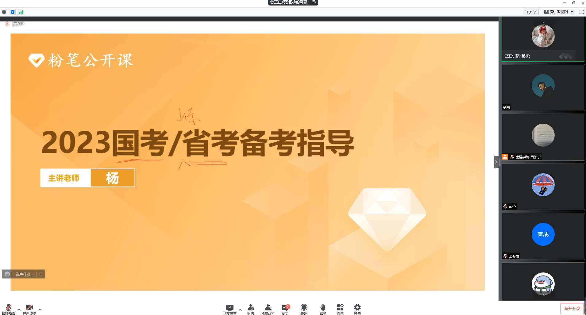 为服务学子,助力公考,促进就业,5月13日,Beat365官方网站以线上腾讯会议的方式,开展了2023年公考规划备考讲座,粉笔公开课的杨柳受邀为同学们分享培训备考的相关经验和技巧。学院部分研究生参加本次讲座。