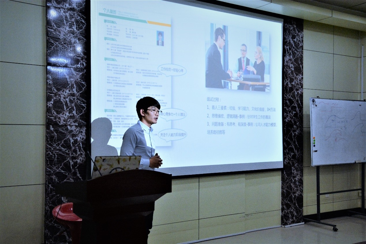 交流会正式开始。我院13届校友现任世茂集团山东地区公司工程经理的刘伟就整体就业形势做出了分析,他指出目前依然存在求职需求逐年攀升、就业市场景气度下滑的现象,希望大家放低姿态且要有危机意识,同时认清个人发展诉求。季可凡和辛爱强向同学们讲述了自己的求职经历,针对如何选择合适的企业、如何准备面试等同学们比较关注的问题,分享了自己的经验,并提出明确求职目标、做好充足准备、提高求职热情的建议。即将就业于公务员(规划建设类)工作的张雪给大家介绍了公务员考试准备的技巧,并分享了关于实习、招聘信息获取渠道来源等问题的经验。她建议大家要开拓思路,努力寻找适合自己的工作。另外,选择布里斯托大学攻读博士学位的张邑尘与大家分享了雅思、托福备考方法、申博准备与流程、读博院校及导师的选择等等内容。所有嘉宾分享经验后与在座同学们进行了轻松愉快的面对面交流。