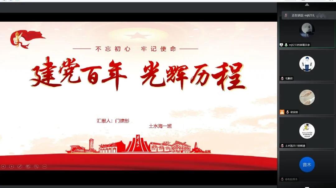 6月17日晚,Beat365官方网站2020级土水海1班于线上开展了“建党百年、光辉历程”主题团日活动。本次活动由组织委员门建彤主持,土水海1班全体团员参加。