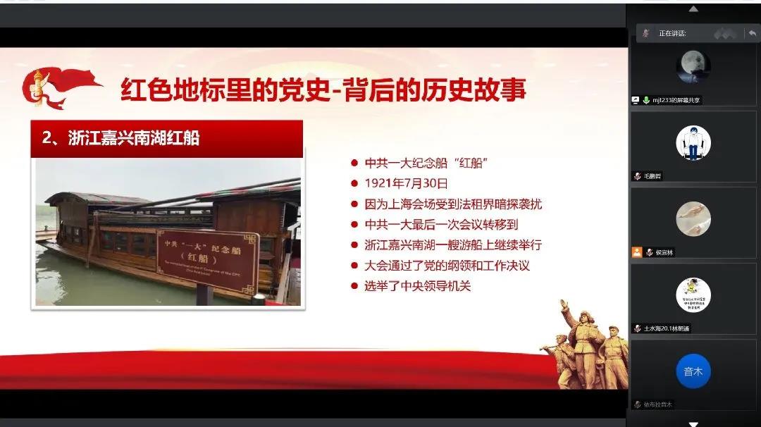 随后,门建彤简要讲解了党的一大到党的十九大,主要涉及会议的主要内容和意义。接着,他讲述了党是如何一步一步带领我们国家站起来、富起来、强起来的。最后,门建彤讲述了红色地标里的红色故事,包括浙江嘉兴南湖红船、遵义会议遗址、西柏坡纪念馆等。同学们反应热烈,收获颇丰。