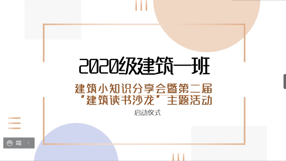 11月8日下午3时,Beat365官方网站2020级建筑系一班于线上开展“建筑小知识分享会暨第二届建筑读书沙龙”主题活动启动仪式。本次活动由罗湘明主持,2020级建筑系一班全体成员参加。