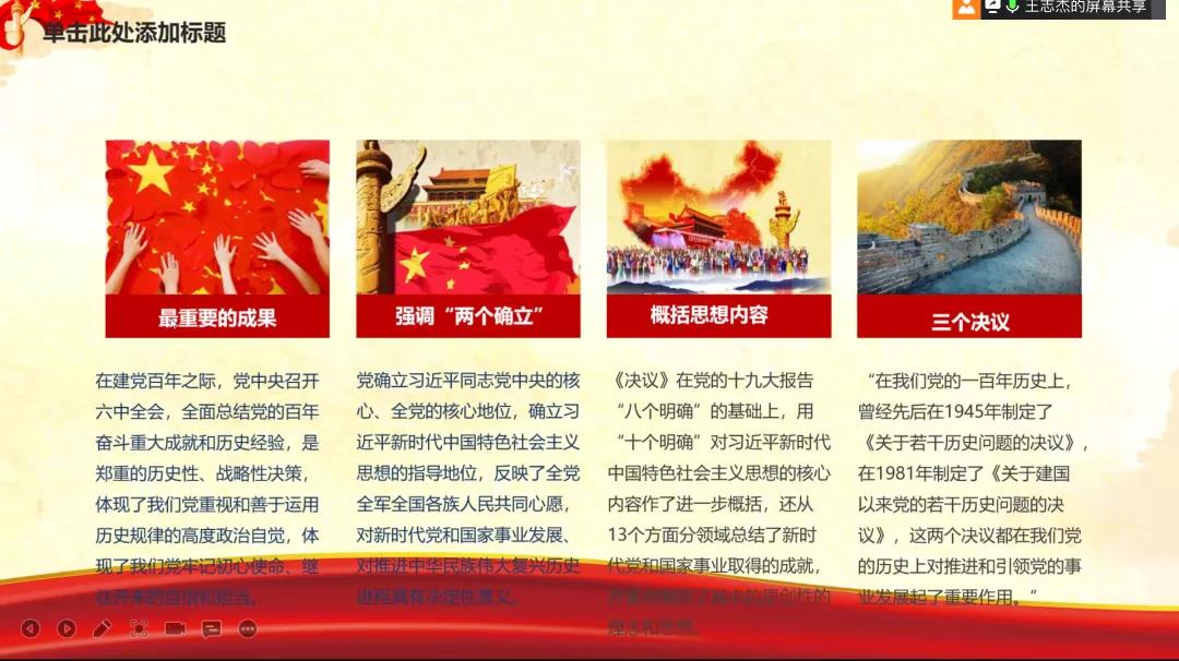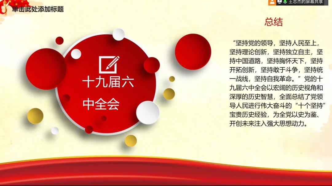 最后王志杰进行了总结:“党的十九届六中全会以宏阔的历史视角和深厚的历史智慧,全面总结了党领导人民进行伟大奋斗的“十个坚持”宝贵历史经验,为全党以史为鉴、开创未来注入强大思想动力。”
