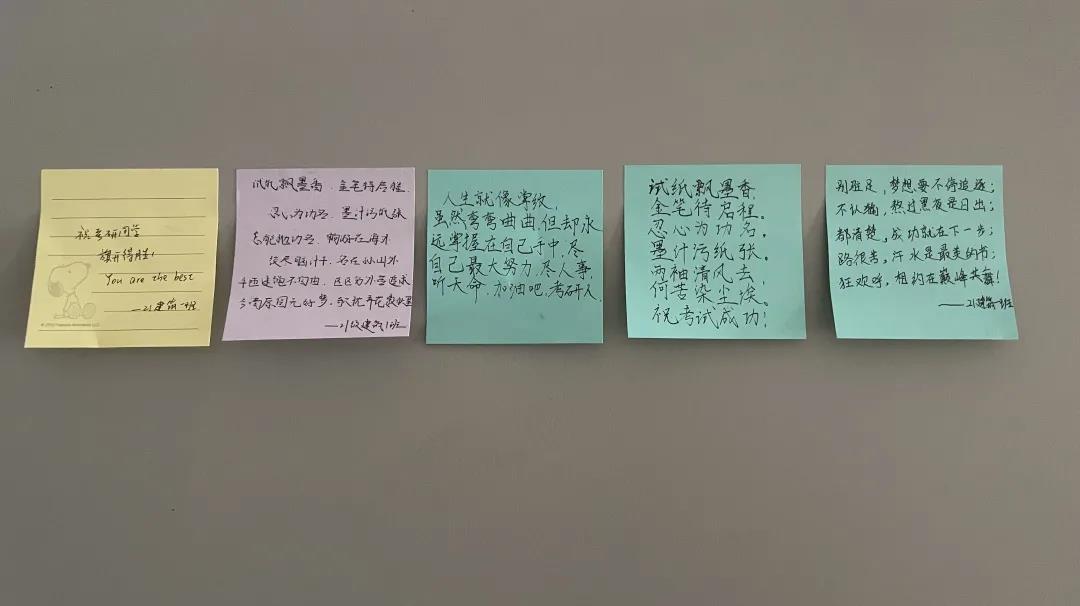 对考研学子的祝福不仅仅流于纸面,建筑学系的同学还找到了身边几位正在备战考研的学长,亲手将明信片交给他们,并和他们拥抱。同学们一致认为,口头语言的表达以及肢体上的祝福相比纸面文字更加直接有效,更能够传达同学们的美好祝愿。