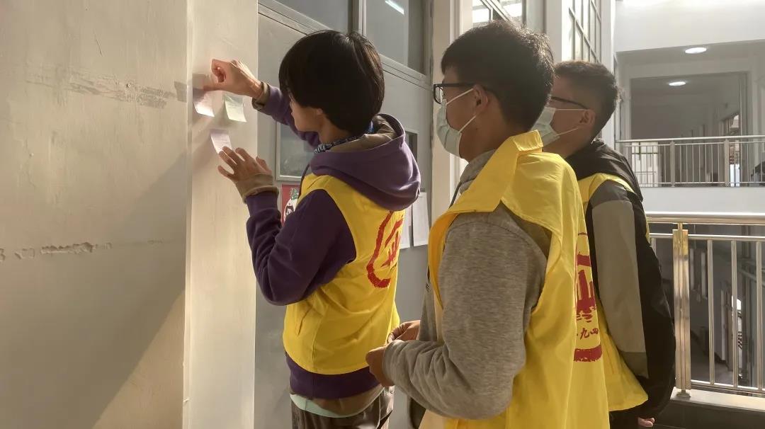 洪瑜首先为参与同学讲解了关注考研学子的目的,并详细讲述了活动开展流程与分工。接着,洪瑜组织两班同学在便利贴以及明信片上写下对考研学子的祝福,部分同学还在明信片上绘制了可爱图样。准备完毕后,同学们分别前往三号楼、八号楼自习室以及讲学堂203、205考研专用自习室,将便利贴贴放在自习室门口。在此过程中,同学们时刻保持安静,避免打扰到自习室内认真备考的同学。