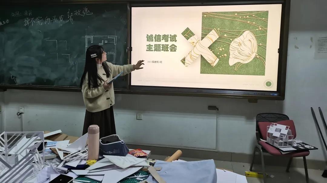 12月17日下午6时, 2021级建筑系二班于兴隆山校区实验楼524教室开展诚信考试主题班会。班长许阳主持,班主任赵亚琛出席,建筑系二班全体同学参加。许阳向同学们详细解释了考试守则的具体内容,强调了诚信考试的重要性。班主任赵亚琛提醒同学们考前调整心态,注意饮食;考后适度放松,合理规划时间。通过本次班会,同学们加强了诚信考试的意识,将以良好的精神状态面对接下来的考试。