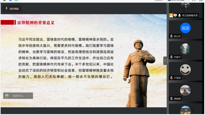3月10日晚7时,2019级土木二班以线上会议方式开展“聆听雷锋故事,传承时代担当”雷锋月主题团日活动,团支书李江主持,2019级土木二班全体同学参加。李江对雷锋事迹和雷锋精神的含义进行介绍。本次主题团日活动充分弘扬了雷锋精神,有利于同学们树立全心全意为人民服务的思想,增强时代担当感和责任感。
