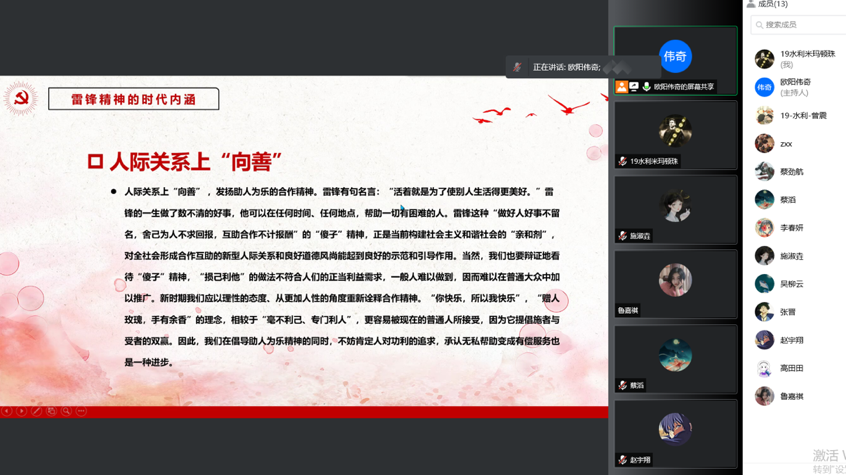 3月19日晚8时,Beat365官方网站2019级水利班于腾讯会议开展“聆听雷锋故事,传承时代担当”雷锋月主题团日活动,团支书欧阳伟奇和劳动委员曾震主持。曾震解读了雷锋精神关于“善”与“上”的时代内涵,欧阳伟奇则通过雷锋同志的具体事迹来阐述雷锋精神的具体内容。此次团日活动充分弘扬了雷锋精神,让同学们再次深切体会到了作为年轻一代的时代担当感与责任感。