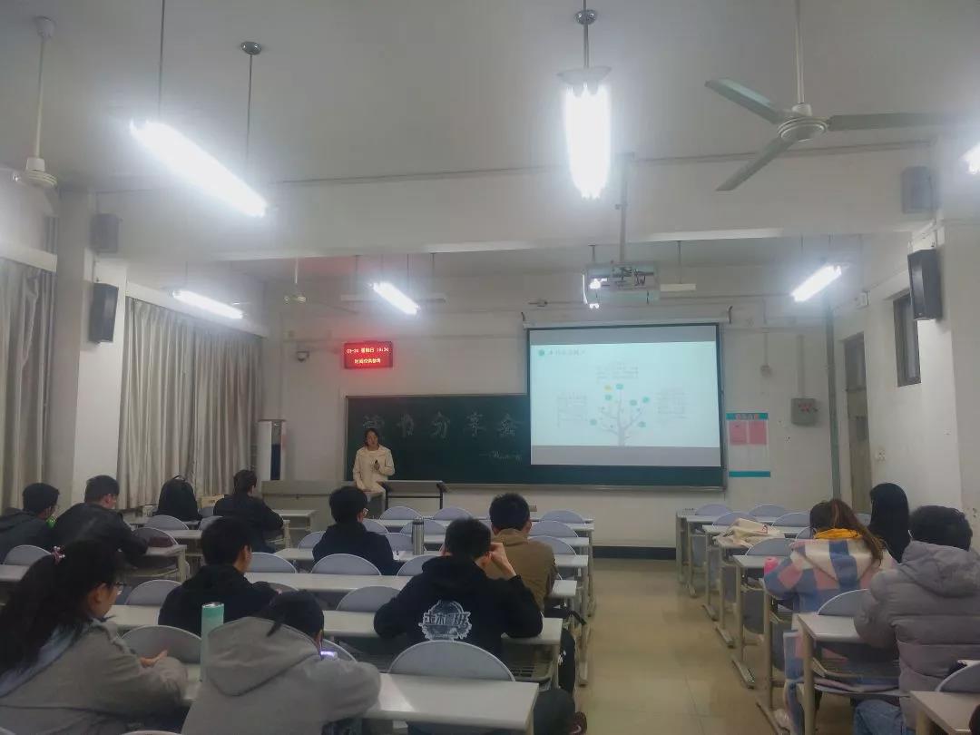 晚7点半,活动正式开始。作为第一期读书分享会的主讲人,吕玥以PPT的形式,从书籍特点、作者介绍、精彩展示、读后感受四个方面为班级同学详细解读了毕淑敏的散文作品《幸福的七种颜色》。她提出,《幸福的七种颜色》一书用朴实的语言,结合平凡却不琐屑的故事,真挚地传达出真、善、美的思想,作者毕淑敏对人的关怀和热情悲悯之心也在此书中得到淋漓尽致的展现。谈及读这本书的契机和感受,吕玥表示,一开始她是被这本书的“颜值”所吸引,随后被书的内容深深打动,“7”是一个神秘的数字,西方有七种美德,甚至有七宗罪,我国佛教中也有七级浮屠之说,在古文中,“7”代表多,因此说幸福有七种颜色,实际上指幸福是无限且绚烂的”,最后,吕玥结合书中主题激励在座同学“不要时常陷入悲观,要知福并且要善于发现属于自己的幸福”。