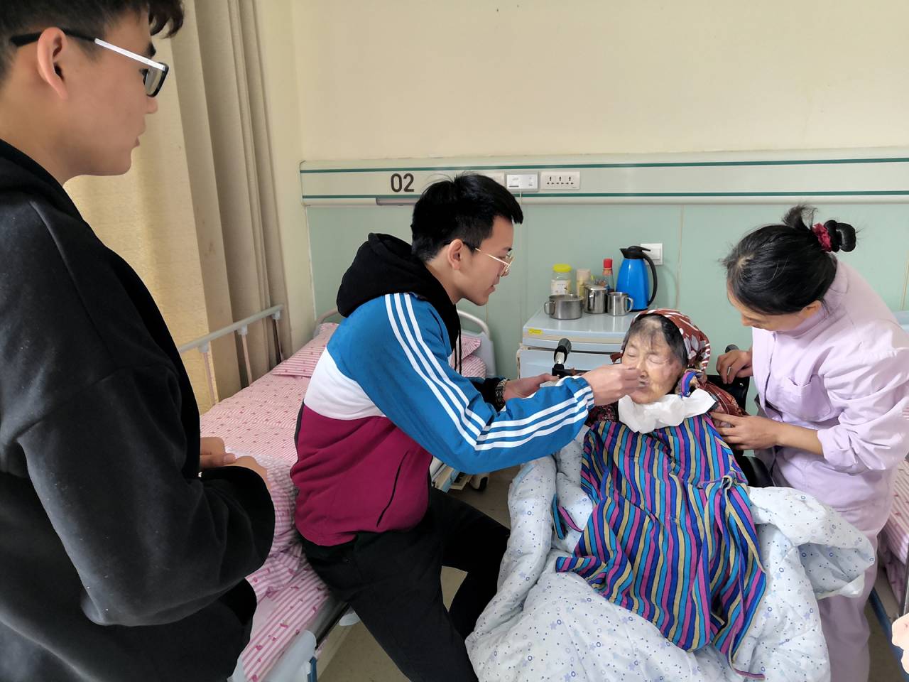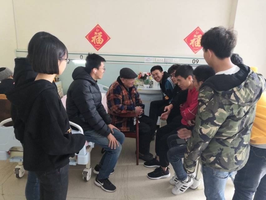 上午8点30分,全部成员到达济南善德养老院,养老院的工作人员对志愿服务队的到来表示热烈欢迎,并带领团队成员简单地了解了养老院的一些基础设施。随后,在工作人员的安排之下,小队成员进行了分工,部分同学帮忙打扫和整理养老院的休息室和图书馆,部分同学陪同养老院老人们聊天。在与爷爷奶奶们的交谈中,小组成员得知这些老人的过往经历,他们有的出身穷苦人家,有的在部队里当过几十年兵,有的甚至是当年战场上幸存的战士。经老人同意后,小组成员协助院内行动不便的爷爷奶奶吃午餐,他们对同学们的帮助表示感谢与感动。午饭结束后,大家帮忙收拾东西并合影留念。