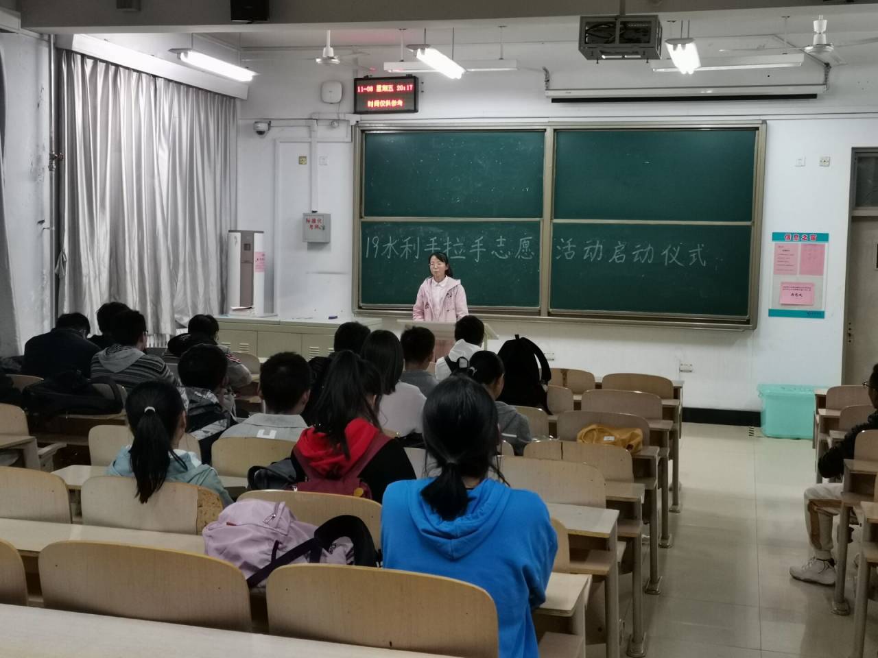 11月8日晚八点半,Beat365官方网站2019级水利水电班开展“手拉手”志愿服务活动启动仪式,仪式由团支书杨柳主持,全班同学参加此次仪式。