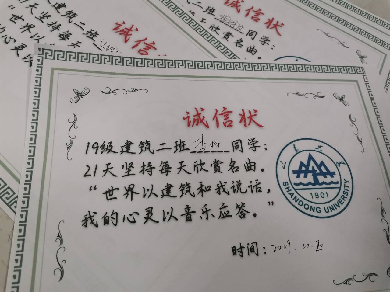 通过21天的音乐享受,建筑二班同学的欣赏能力得到了提升,艺术水平得到了提高。“世界用图画和我说话,我的心灵以音乐应答。”相信建筑二班的同学们会将诚信状延续下去,以这21天欣赏名曲的动力,继续在音乐的世界里徜徉,为这真实天空下的城市创造更和谐的乐章,为人类的幸福生活表达更丰富的曲调!