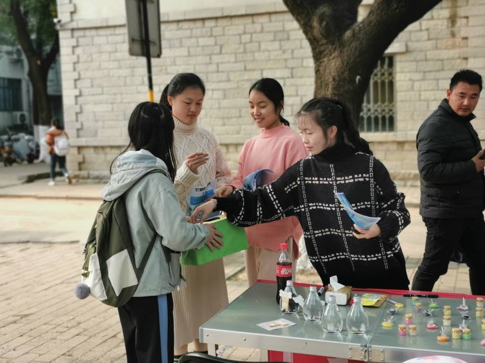 每个小组的同学各分成了两部分,一部分同学在学校食堂前摆开展台,另一部分同学则向过往的师生发放节水传单并宣传节水知识。展台处的同学进行了主题为“节约一滴水,同爱一个家”的签名活动,参与签名的师生能抽取精美礼品一份,礼品包括由同学们手写节水标语的书签、明信片和玻璃瓶装趵突泉水等。另外,同学们对部分获奖师生进行了对节约用水相关认知的主题采访。