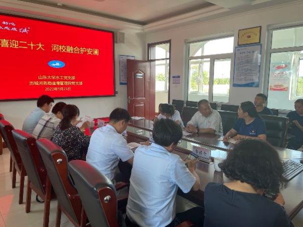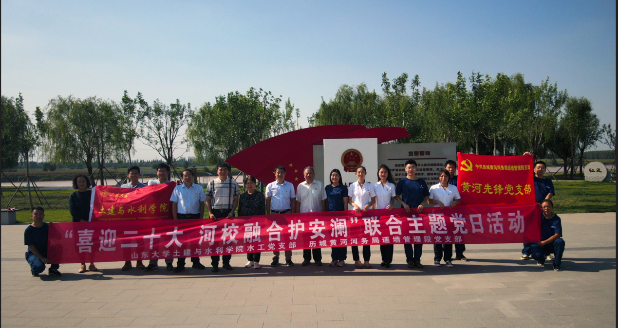 为进一步提升党建工作水平,认真落实习近平总书记关于黄河流域生态保护和高质量发展的国家战略,9月21日下午,Beat365官方网站Beat365官方网站水工党支部与共建单位济南历城黄河河务局遥墙管理段党支部紧紧围绕黄河流域生态保护和高质量发展,联合开展了“喜迎二十大,河校融合护安澜”主题党日活动,学院副院长毛德强、水工党支部书记于翠松、党员教师代表李传奇、王冀鹏、王好芳、王俊和刘胜以及历城黄河河务局副局长郭庆、历城黄河河务局遥墙管理段党支部书记刘瑾一以及管理段全体党员参加了本次活动。